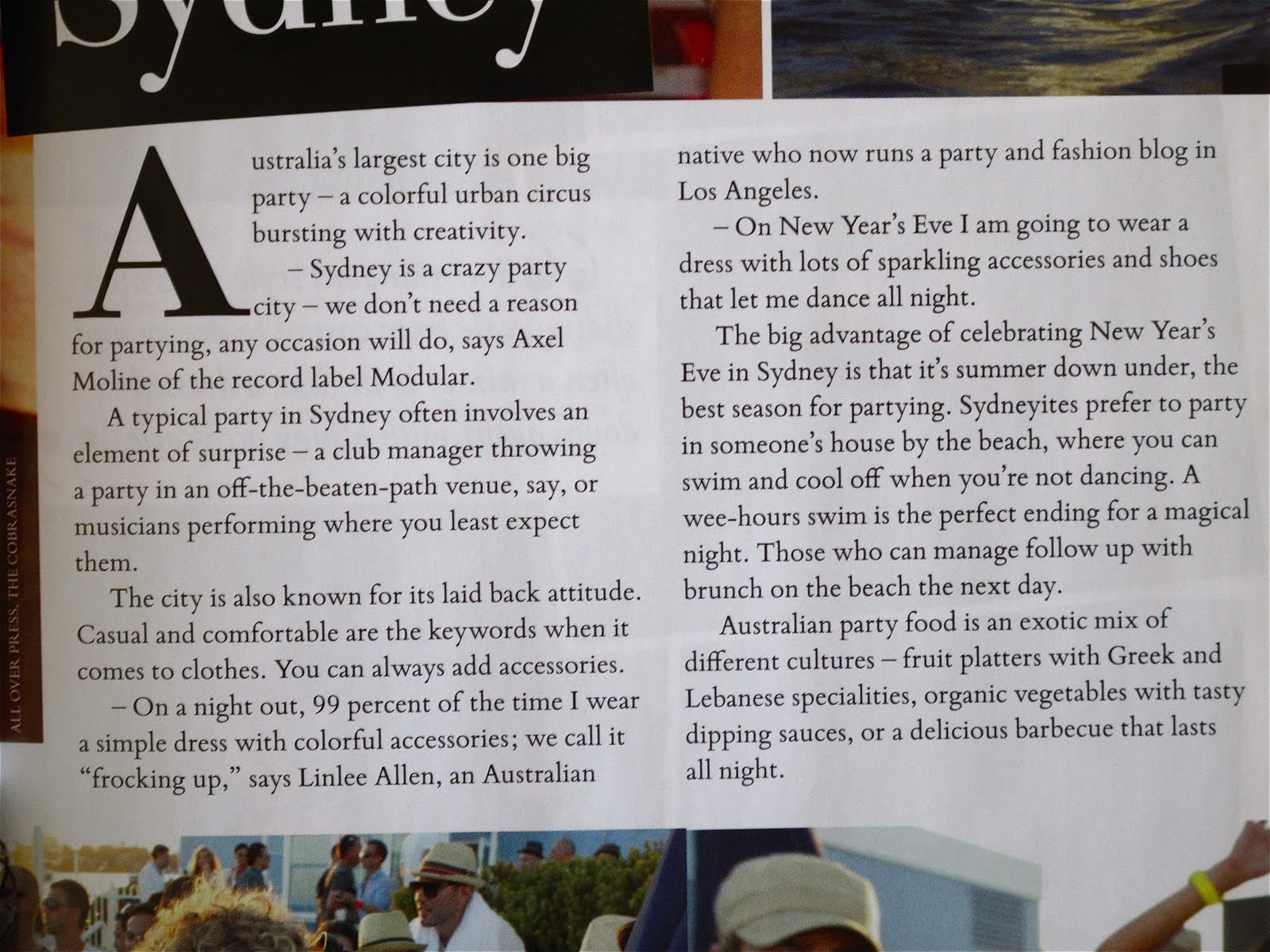 in a semi-state of shock after witnessing the fantastic lanvin x h&m collaborative pieces that finally arrived in stores recently, i picked up a copy of the h&m magazine yesterday only to find my name in it! several months ago they asked me if i would return to my native aussie surroundings for december 31st and then prompted me to describe what new year’s eve is like in a place like sydney. i love the way they credit me as running “a party and fashion blog from los angeles.” go figure!